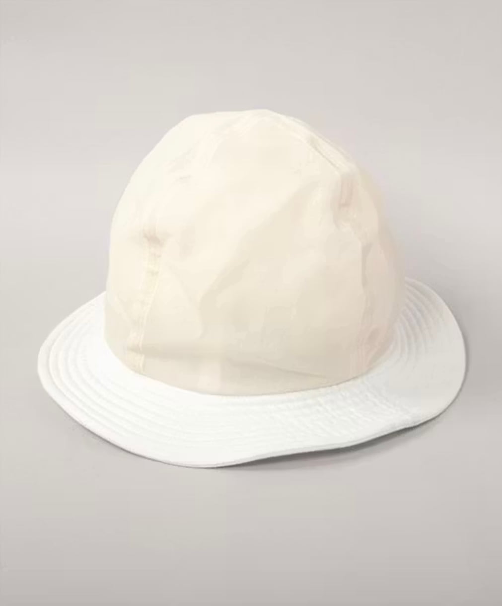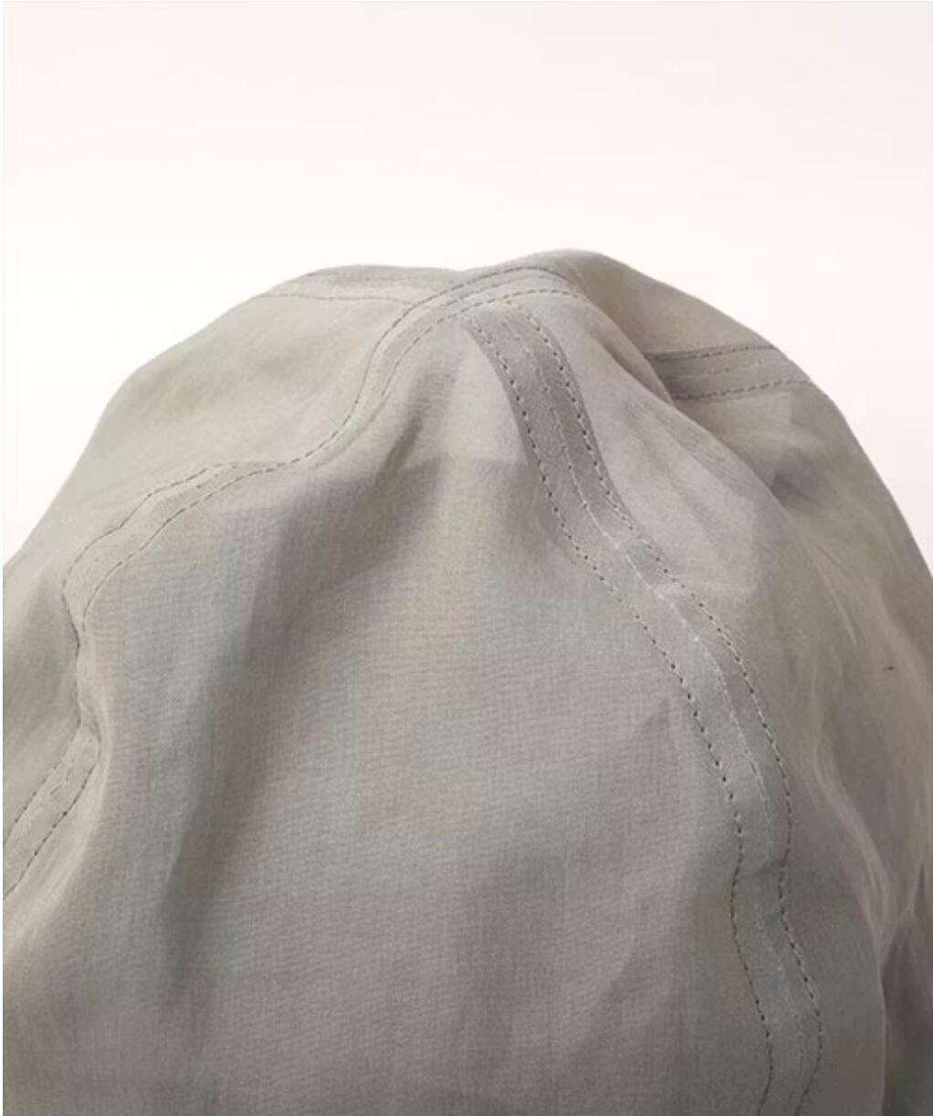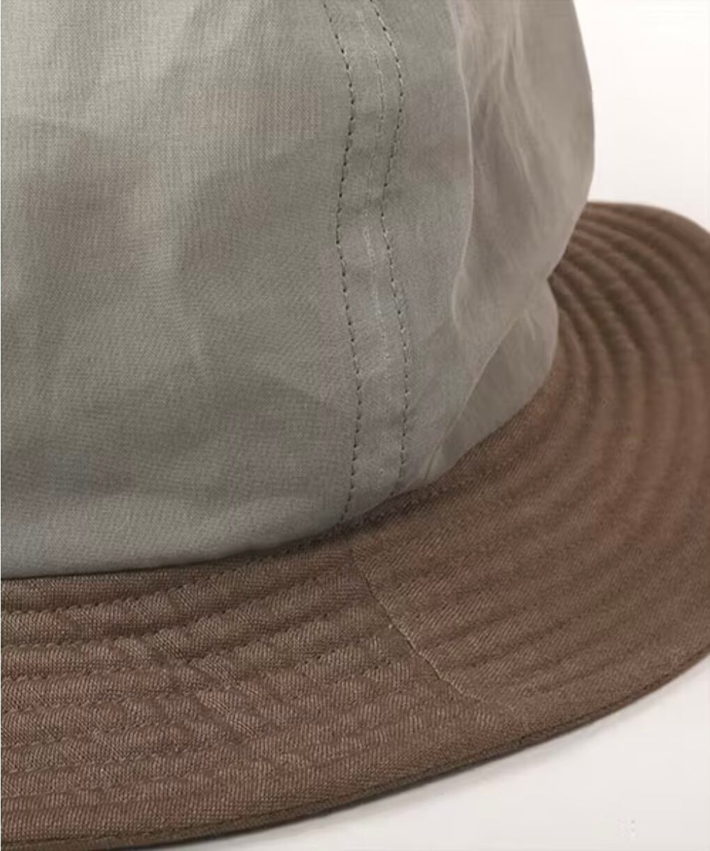 クラウン部分に透け感のある生地を重ねたレイヤードデザインが魅力。自然に生まれるシワ感をお楽しみください。
