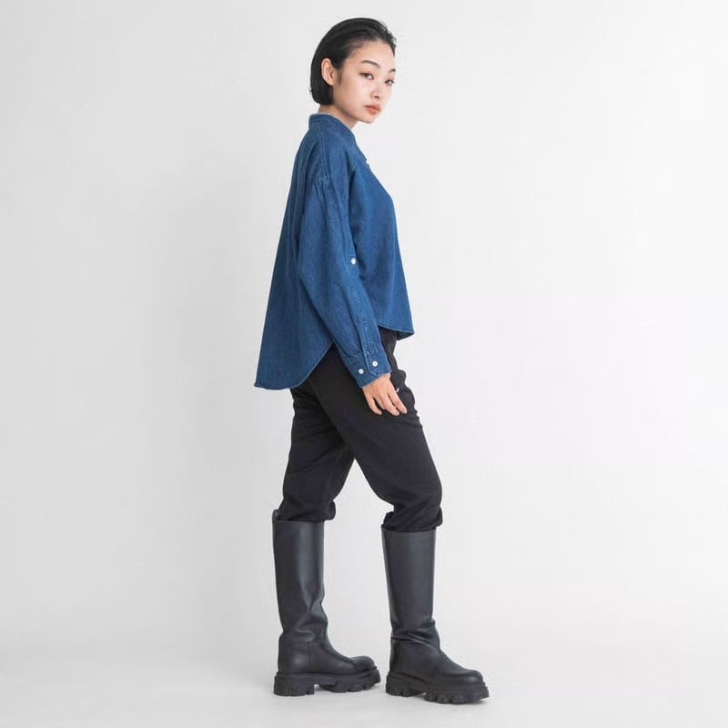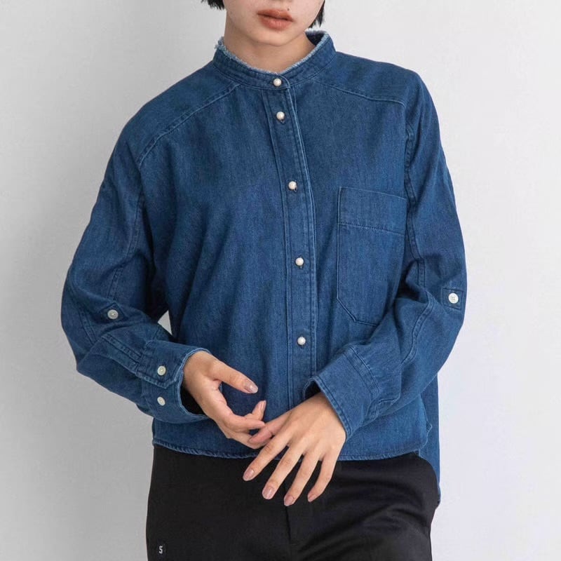 洗いざらしでケアが簡単なデニムと上品なパールボタンが好相性。