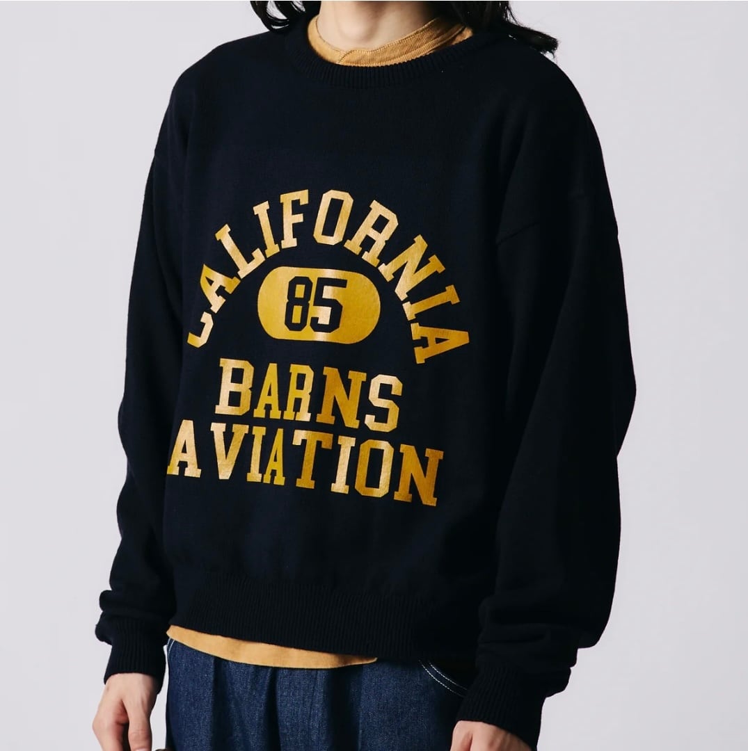 アメカジ好きなら誰もが1度は袖を通したことのあるカレッジロゴのアイテム。その起源は1920~30年代にアイビーリーグと呼ばれるアメリカ北東部の私立8大学が運動部用に製作し、大学生協で販売したとされている。またチームの象徴として動物や偉人などをモチーフとする文化があり、チームによってさまざまなマスコットが存在する。今では各学校にそれぞれのマスコットやカラーがあり、学校の顔としてアイデンティティとなっている。今回は1985年に結成された架空の航空クラブのメンバーアイテムをイメージし、カレッジロゴに仕上げた。