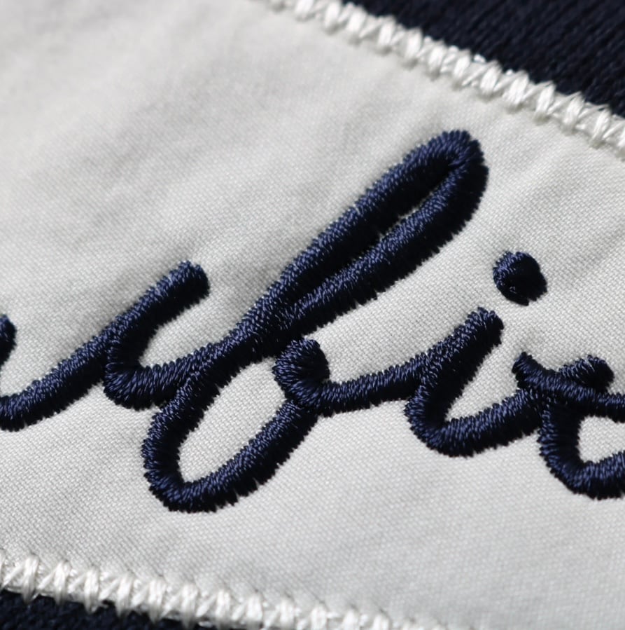 長い歴史を持つBARNS OUTFITTERSは歴代様々なブランドロゴを使用してきた。その中でも通称カーシブロゴといわれる筆記体や草書からインスパイアされたロゴを使用し、プリントではなくサテン素材を千鳥ステッチで縫い上げた。クラシカル見た目だけでは終わらない