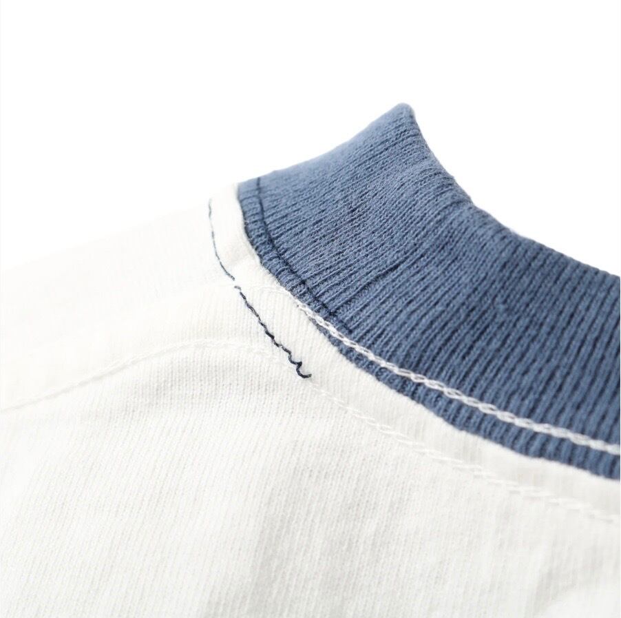 BARNS OUTFITTERSが1年を通して様々な形でリリースを続ける"COZUN"シリーズ。ヘビーウェイトな生地をゆっくりと時間をかけて編み立てる小寸編み機はBARNS OUTFITTERSを象徴するタフなモノづくりに欠かすことはできない。定番アイテムとしてリリースを続けるアイテムは昔ながらのクラシックフィットとして変わらぬ人気を誇る。そんな”COZUN"シリーズは着込んでいくごとに生地が身体に馴染み、唯一無二の1枚へと成長していく1枚。ネックと袖を配色にしたリンガーTシャツが登場。70年代から80年代の大学アメフトのチームウェアを彷彿とさせるデザイン。