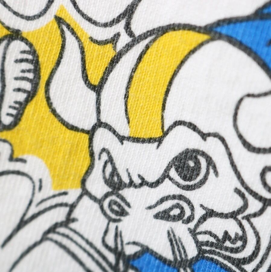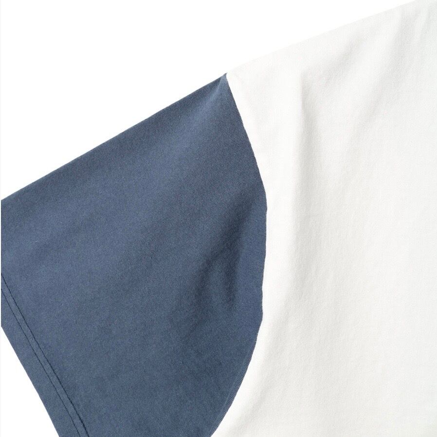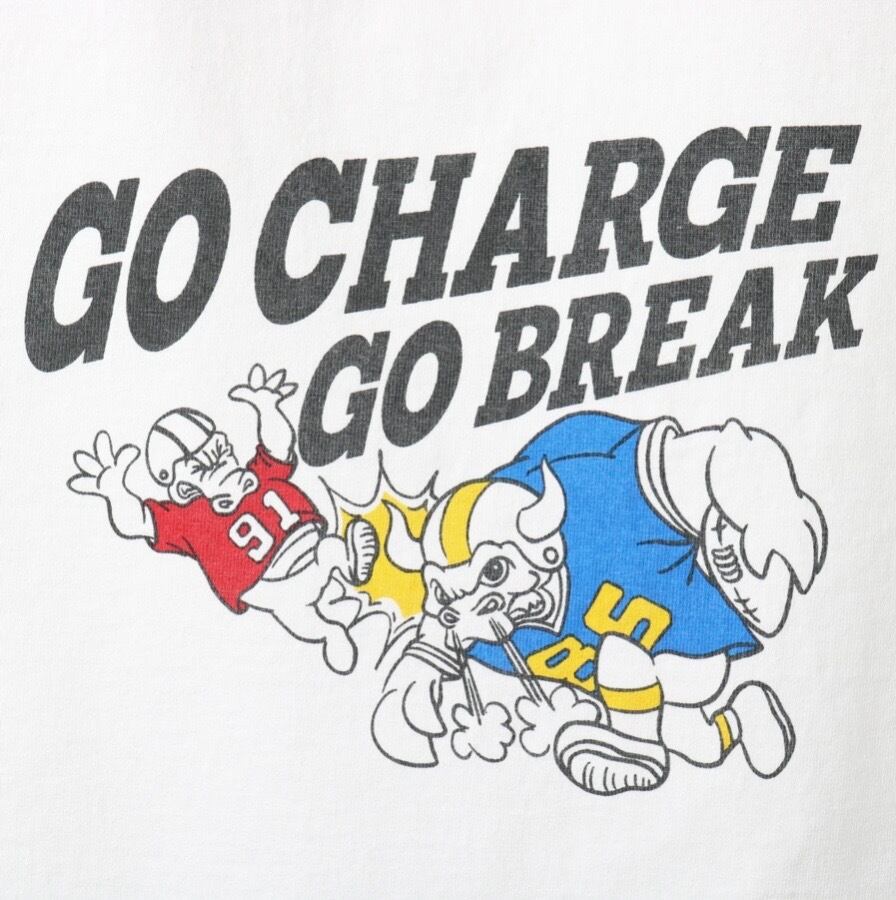 年間通して人気の高いヘビーウェイトな生地を使用したBARNS OUTFITTTERS定番素材を使用した新型の1枚。通常袖の配色は袖口にパイピング状の切り替えを入れることが多いが今回は袖ごと配色にする贅沢ながらクラシカルな仕様を採用。"GOCHARGE GO BREAK”というスタジアムの空気感をそのまま閉じ込めたようなデザインは熱狂と興奮の渦を感じさせる。70年代から80年代を彷彿とさせるデザインに合わせてプリントはウォッシュアウトを採用し、全体の統一感を演出。